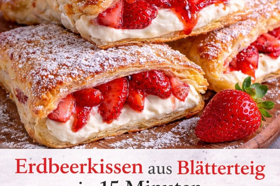 Zutaten (für ca. 6 Stück) 1 Rolle Blätterteig (aus dem Kühlregal) 250 g frische Erdbeeren (gewaschen und klein geschnitten) 1–2 EL Zucker (nach Geschmack) Optional: Vanillezucker… Read More »Erdbeerkissen aus Blätterteig in 15 Minuten schmecken Genial!