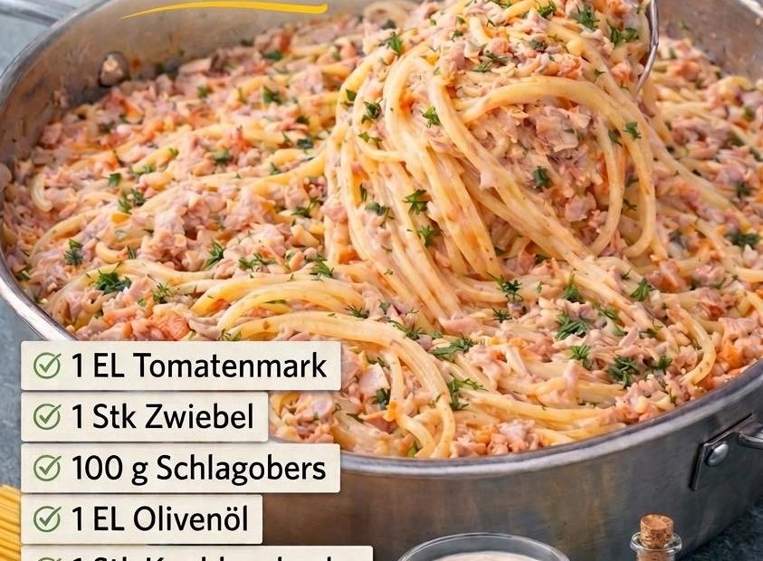 250 g Spaghetti 1 Stk Zwiebel 1 Dose Thunfisch 1 EL Öl 1 Becher Schlagobers 1 Prise Pfeffer 1 Prise Salz 1 EL Tomatenmark 3… Read More »Die ultimative cremige Thunfisch-Pasta! 🍝✨