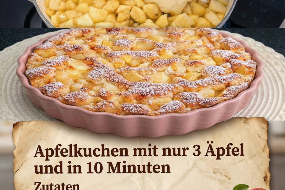𝗭𝗨𝗧𝗔𝗧𝗘𝗡: 250 g Mehl 2 Packung Vanillepuddingpulver 3 Eier 160 ml Milch 3 große Äpfel 120 g Zucker 2 Packung Vanillezucker 250 g Butter etwas… Read More »Apfelkuchen mit nur 3 Äpfeln, in 10 Minuten gemacht, einfach unwiderstehlich