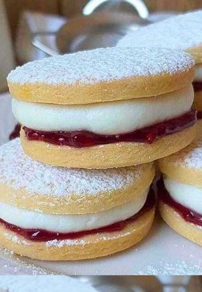 Nun nach dem Backen die Sahne-, Mascarpone- und Marmeladenfüllung zugeben, den Puderzuckerkeks darüber streuen und zusammenfügen.