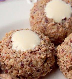 3. Nun Jede Kugel im oberen drittel mit ein wenig heller Baisermasse überziehen und in die Mitte eine ganze Haselnuss leicht eindrücken. Backzeit: 30 – 35 Min. /125°C. Fertig!