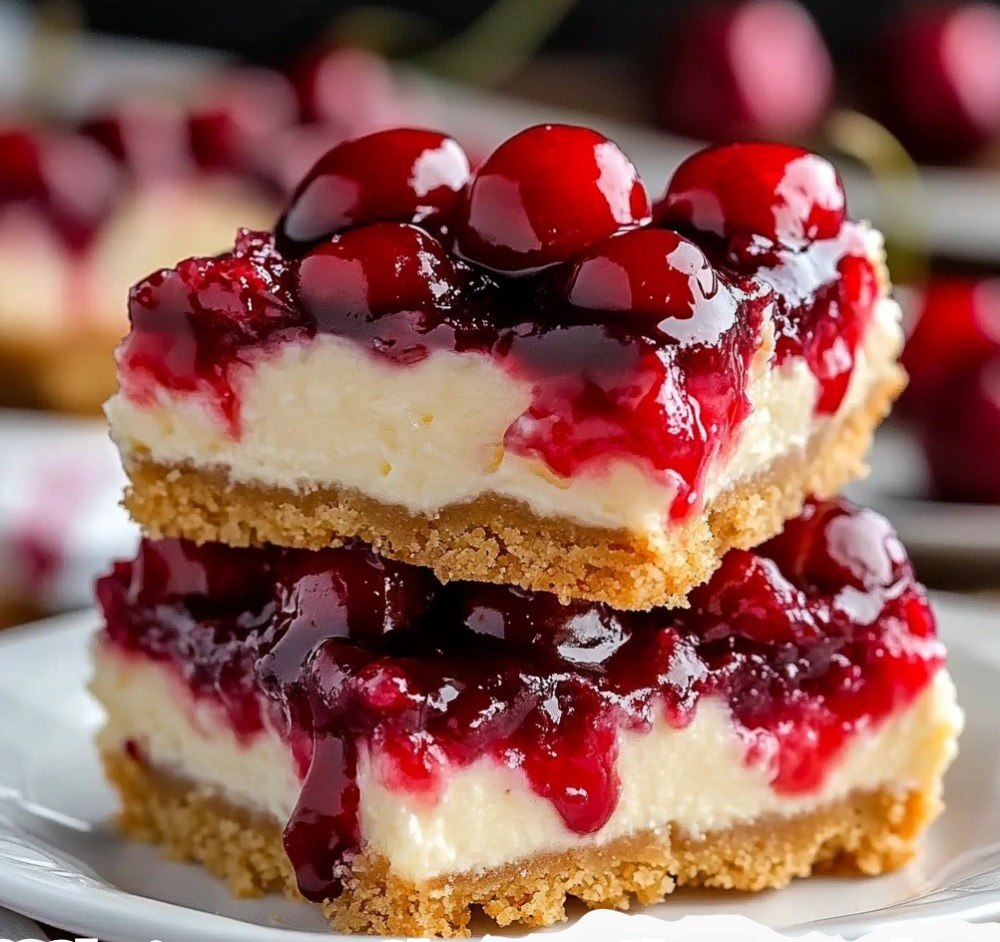 - Die Kirschkuchenfüllung gleichmäßig über die abgekühlte Käsekuchen-Schicht verteilen.