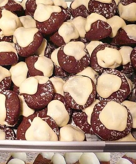 4. Inzwischen die Schokolade über dem Wasserbad schmelzen und dann jeden Berg mit “Schnee” bedecken. Die Kekse bewahrt Mann am besten in einer Keksdose auf, in der sie von Tag zu Tag besser werden.