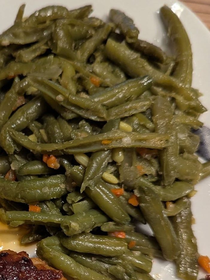 - Grüne Bohnen und Tomatenmark dazugeben, gut vermischen und mit Salz, Pfeffer und Paprikapulver würzen.