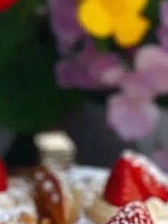 ◦ Die gebackenen Erdbeerkissen aus dem Ofen nehmen und auf einem Kuchengitter abkühlen lassen. Vor dem Servieren mit Puderzucker bestäuben und mit der vorbereiteten Paradiescreme servieren.