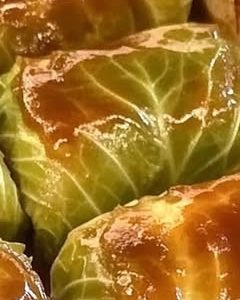 Ein Kohlblatt nehmen, mit der vorbereiteten Fleischmischung füllen und sorgfältig einrollen, die Seiten dabei einschlagen, damit die Füllung nicht herausfällt.