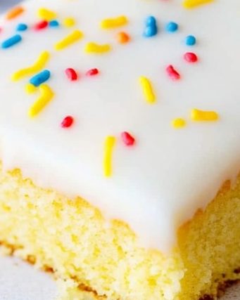 Puderzucker mit Orangenlimonade verrühren. Den Guss auf dem Kuchen verteilen und mit bunten Streuseln bestreuen.