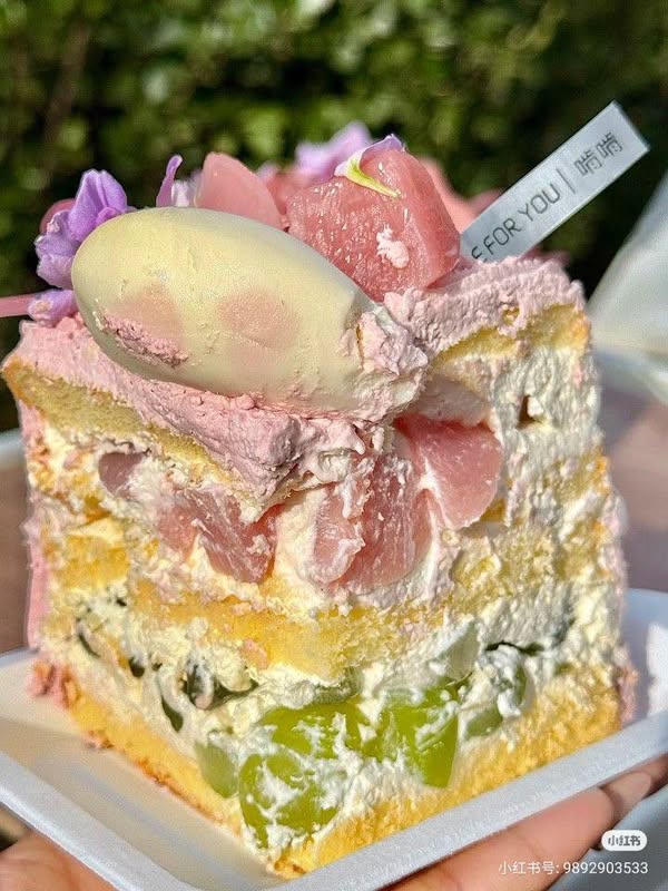 Mit rosa Sahne, weißen Mini-Schokoladeneiern, Blüten und Fruchtstücken dekorieren.