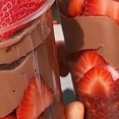 Oben eine halbe oder ganze Erdbeere mit Grün auf die Creme setzen.