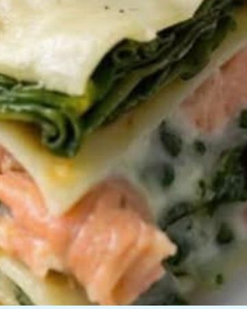 In einer Auflaufform abwechselnd Lasagneplatten, Spinat-Frischkäse-Masse und Lachsstücke schichten.