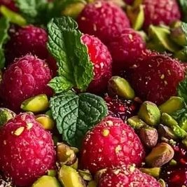 Vor dem Servieren die Torte mit frischen Himbeeren, gehackten Pistazien und Minzblättern garnieren.