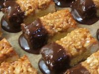 Solange das Gebäck noch warm ist, in kleine Riegel (etwa 3 x 1,5 cm) schneiden. Nach dem vollständigen Abkühlen ein Ende der Riegel in geschmolzene Kuvertüre tauchen, auf Backpapier oder Alufolie fest werden lassen. Die unteren „Füßchen“ bei Bedarf abschneiden.