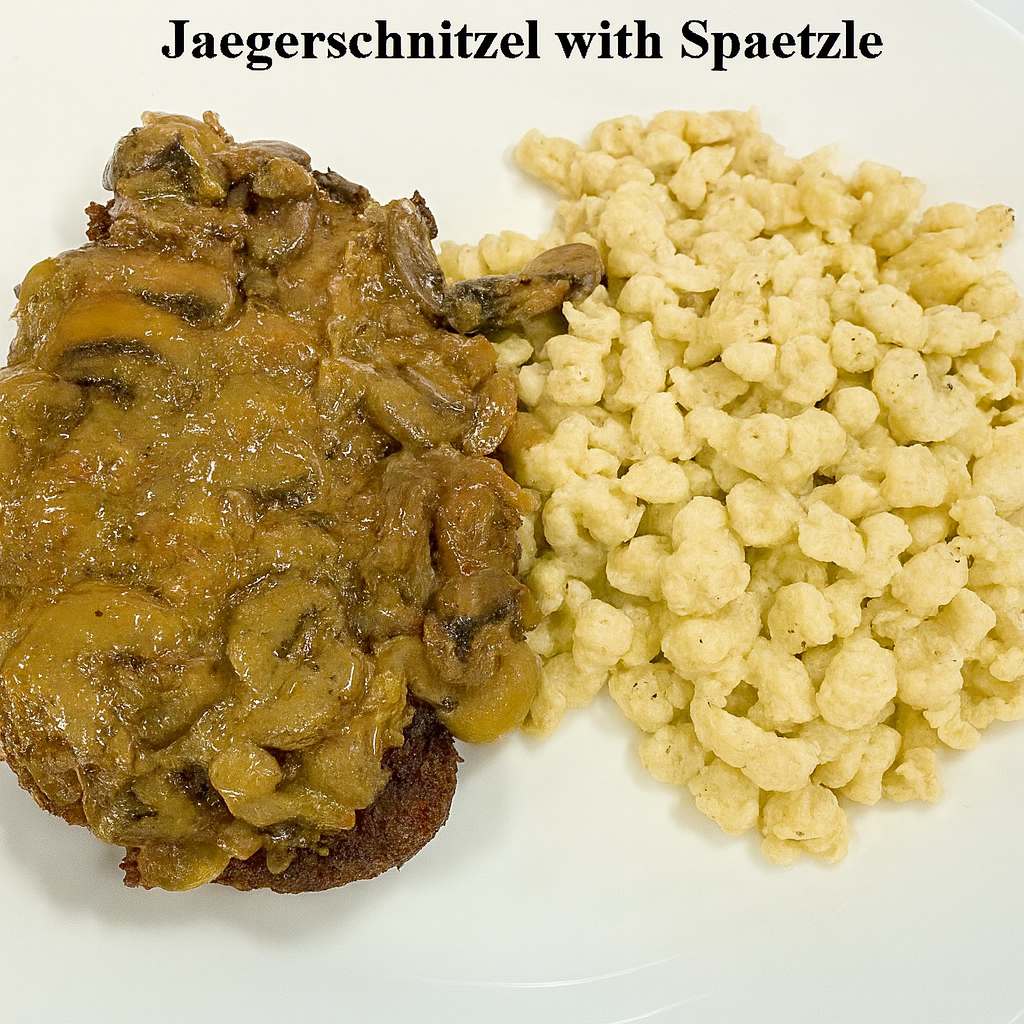 4️⃣ Servieren: Schnitzel mit Pilzsoße übergießen und zusammen mit den Spätzle servieren.