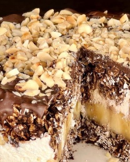 - Kuchen zusammensetzen: Die Creme gleichmäßig über die Bananenschicht streichen. Anschließend die restliche Hafermasse vorsichtig darüber verteilen und leicht andrücken.