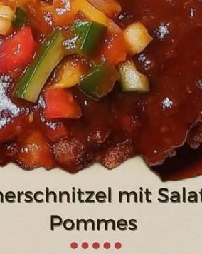 6. Nun alles zusammen auf einem Teller anrichten: Das knusprige Schnitzel mit der warmen Zigeunersoße, dazu den frischen Salat und die goldgelben Pommes.