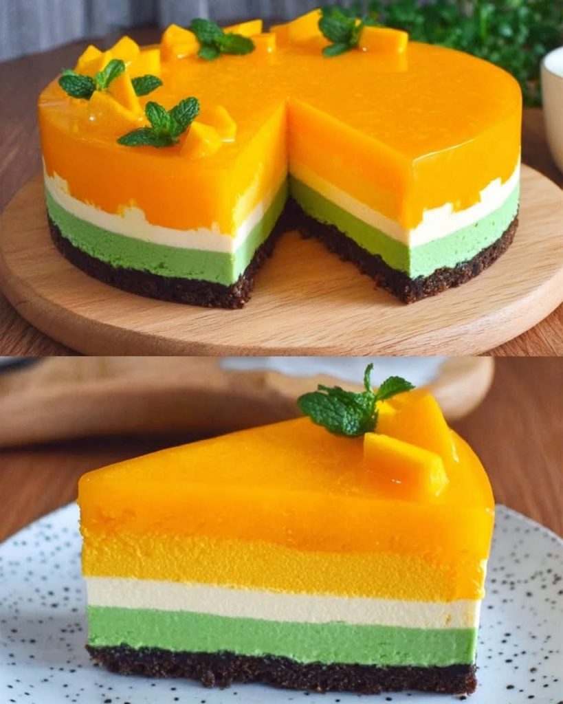 Minzgelee: Gelatine einweichen. Wasser mit Minzsirup verrühren. Geschmolzene Gelatine hinzufügen und die Mischung über die erste Schicht Melonencreme gießen.
