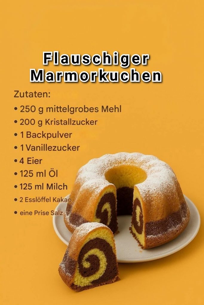 Die Form einfetten und den Teig hineingeben. Abwechselnd den hellen und den Kakaoteig hineingeben. Mit einem Spieß leicht verrühren, sodass ein Marmormuster entsteht. 45–55 Minuten bei 170 Grad backen. Auskühlen lassen, stürzen und mit Zucker bestreuen.