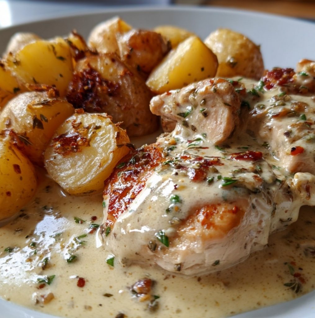 Cremiges Knoblauchhühnchen mit gerösteten Babykartoffeln