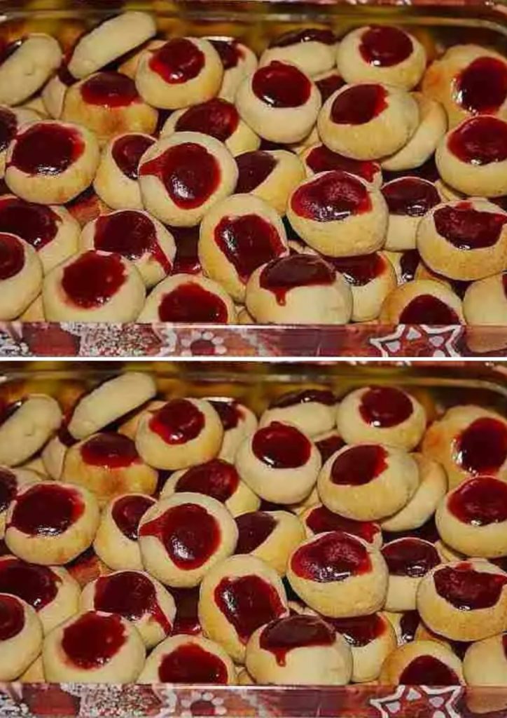 2. Danach haselnussgroße Kugeln aus dem Teig formen und mit einem angefeuchteten Kochlöffelstiel kleine Mulden in die Kugeln stechen. Nun mit einem Teelöffel vorsichtig jeweils etwas Gelee in die Mulden geben.