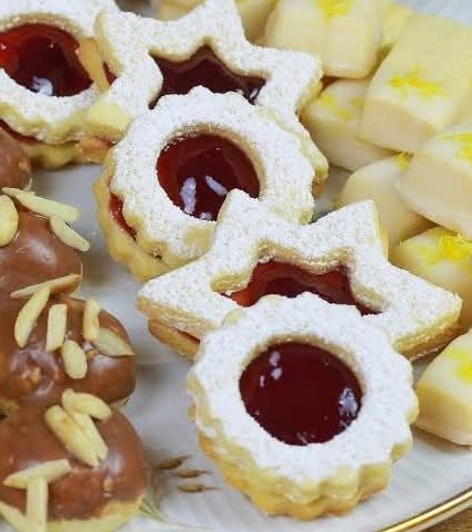 10 Traumplätzchen, 10 Husarenkrapfen, 12 Vanillesterne, 20 Zimtstangen, 10 Knusperkugeln, 10 Schokosterne mit Streusel, 10 Zitronenplätzchen, 20 Glühweinherzen, 20 Vanillekipferl, 10 Nugattaler, 10 Schokoküsschen und aus dem Rest Kordelschnüre….