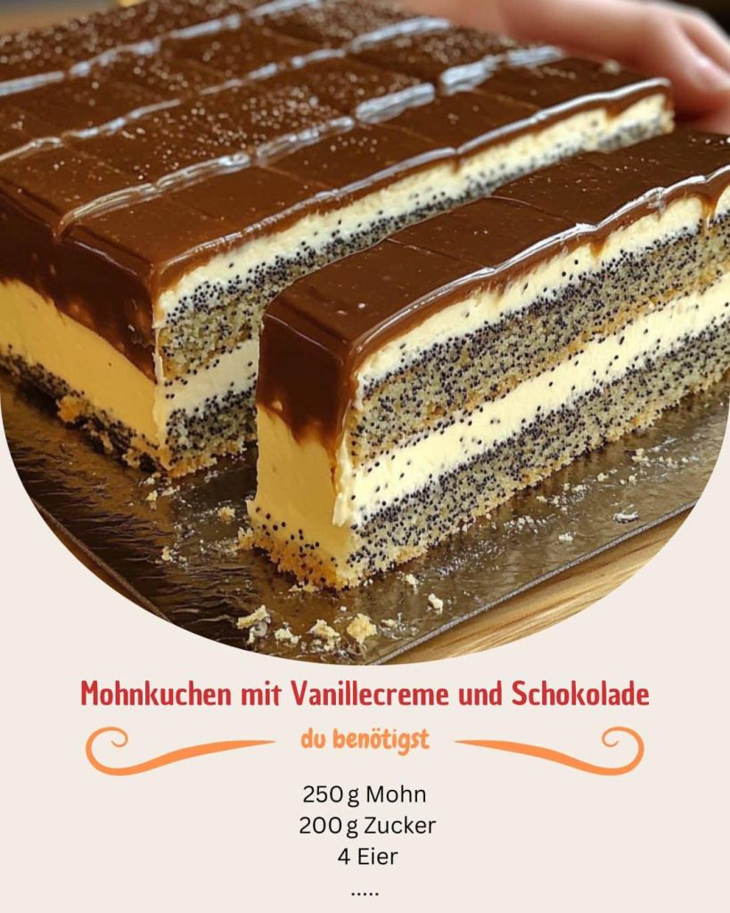 Schichtkuchen aus Mohn und Vanille mit zartschmelzender Schokoladendecke