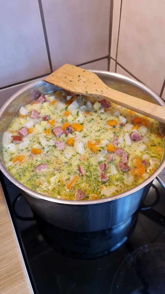Jetzt Die Wiener Würstchen in Scheiben schneiden und in den Topf geben, etwas ziehen lassen.