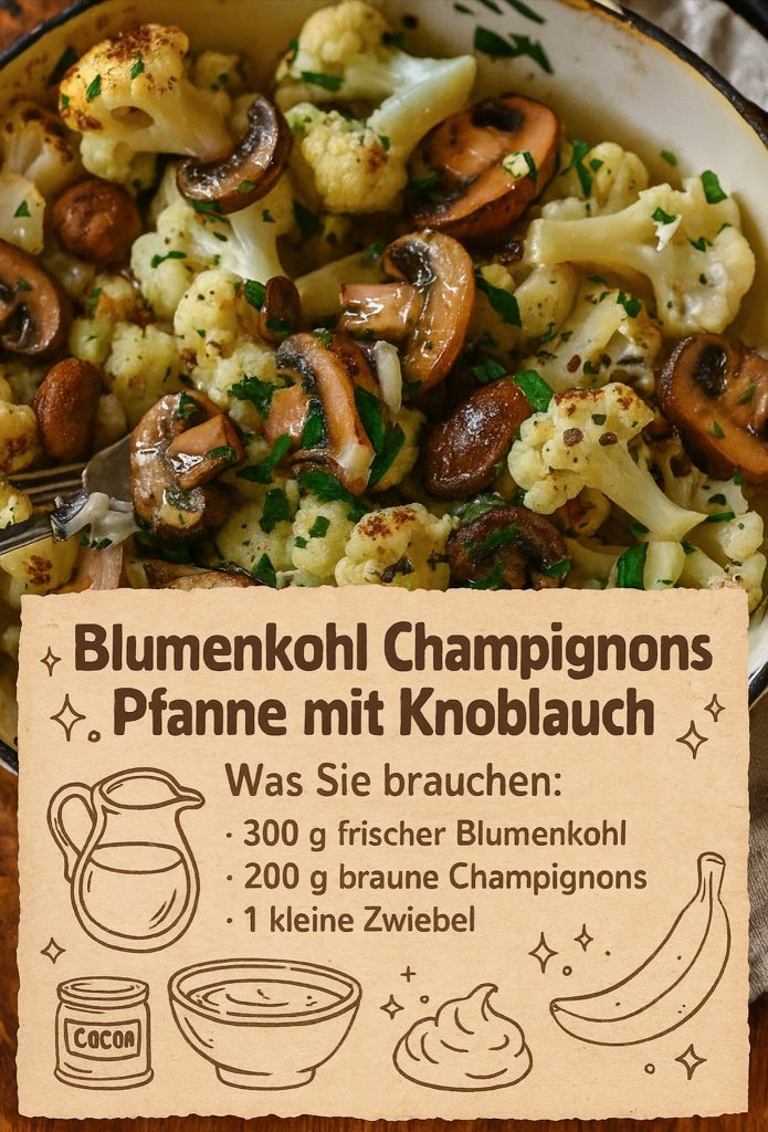 Serviere die Blumenkohl-Champignon-Pfanne als Beilage zu Fisch, Fleisch oder als Hauptgericht mit Reis.