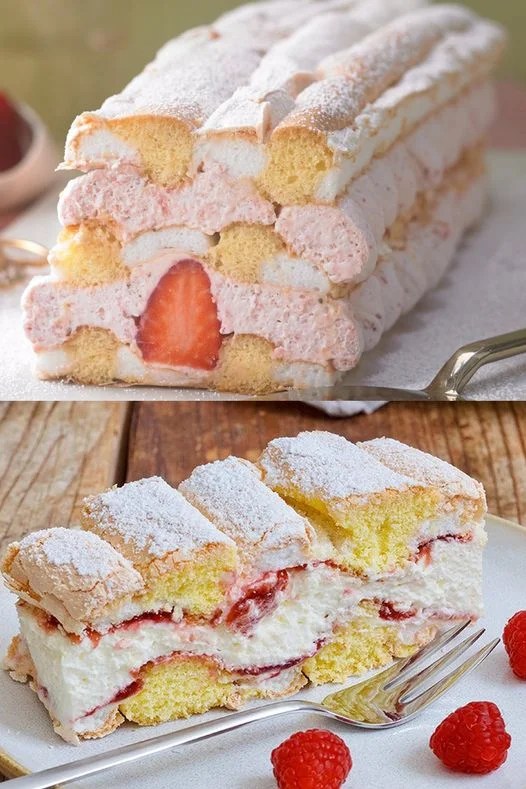Jetzt Das Obers steif aufschlagen, die geputzten Erdbeeren darunter heben und ebenfalls aufstreichen, zweiten Boden aufsetzen, mit Staubzucker bestreuen!