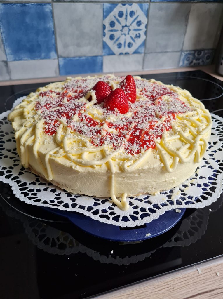 3. Jetzt den ausgekühlten Biskuit einmal durchschneiden. Den ersten Boden dünn mit der Creme bestreichen, mit den leicht gezuckerten Erdbeeren belegen und mit ca. einem Drittel der Creme bestreichen.