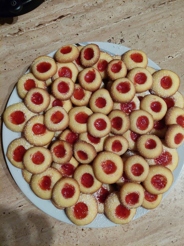 Aus dem Teig kleine Kugeln formen und auf ein gefettetes Backblech legen, jede Kugel in der Mitte mit dem Finger leicht eindrücken, entstandene Löcher mit ½ Löffel Marmelade füllen, mit restlichem Eigelb bestreichen.