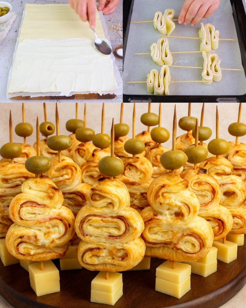 2. Teig zusammenklappen und in Streifen schneiden. Jede Teigstreife zu einer „Tannenbaum“-Form drehen und auf Holzspieße stecken.
