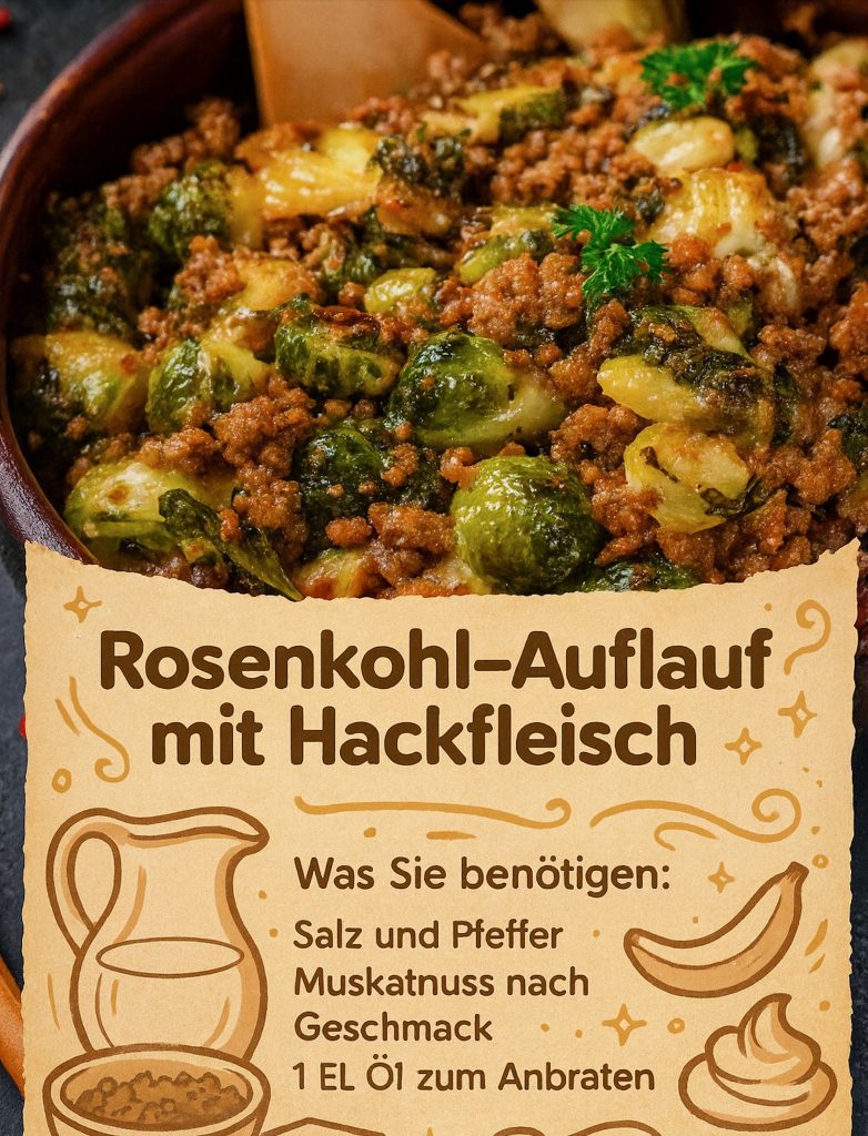 Kartoffeln ungeschält abkochen, pellen, in Scheiben schneiden. Rosenkohl kochen, bis er die gewünschte Konsistenz hat. Hackfleisch und Zwiebeln anbraten, mit Salz und Pfeffer würzen. Wenn das Hack durch ist, mit Milch auffüllen, Schmelzkäse unterrühren. Mit Maggi und Zitronensaft würzen. Mehl und etwas Milch mischen, unterrühren, um die Hacksauce sämiger zu machen. Nach Geschmack nachwürzen mit Salz oder Maggi. Da die Kartoffeln salzlos sind, darf die Sauce gerne etwas kräftiger sein.Auflaufform einfetten. Kartoffeln hineingeben, Rosenkohl darauf verteilen und die Hackfleischsauce darüber geben. Dünn mit Paniermehl bestreuen und Butterflocken darauf setzen. Den Auflauf bei 200° ca. 30-40 Minuten in den Ofen schieben, bis das Paniermehl gebräunt ist.