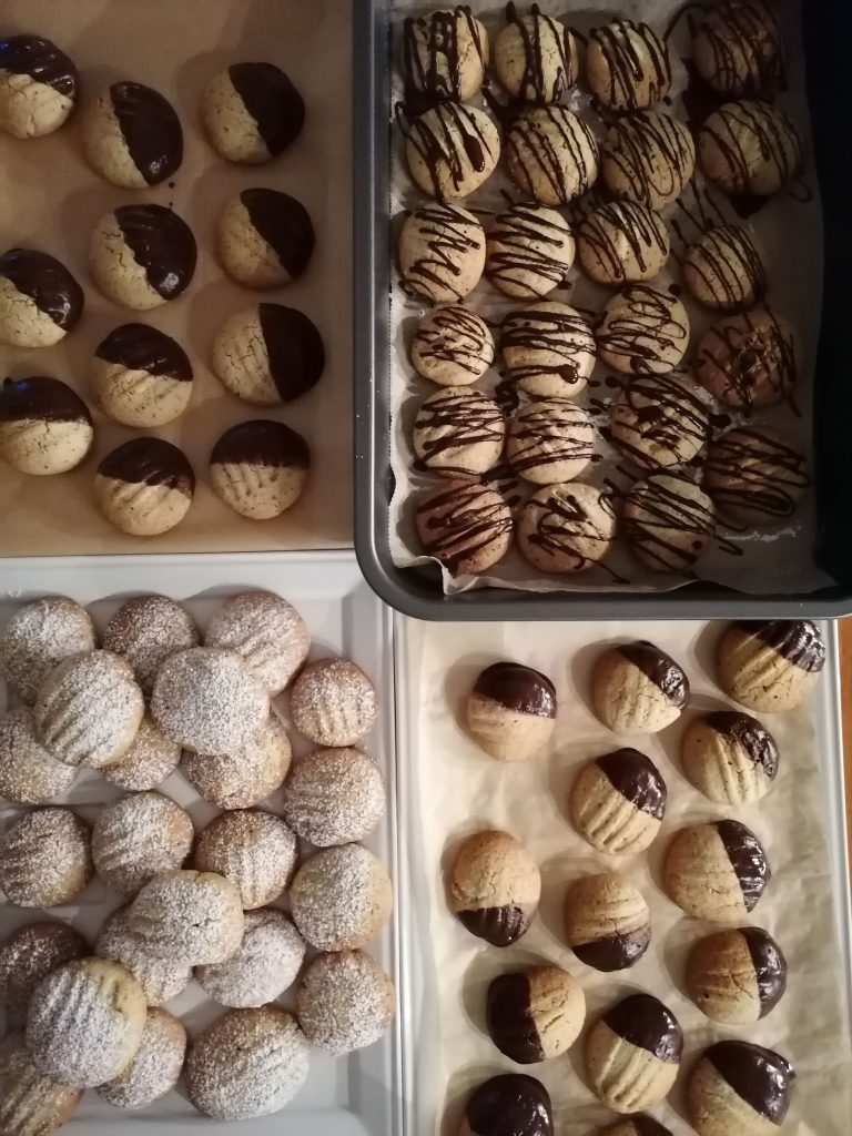Aus Butter, Zucker, Ei, Zitrone, Mehl, Puddingpulver, Aroma, Mandeln einen Mürbteig kneten, zuletzt die Früchte einkneten, aus dem Teig walnussgroße Stücke zu Kugerl formen und auf ein mit Backpapier ausgelegtes Blech setzen, im vorgeheizten Rohr bei 160° Heißluft ca. 8-10 min backen, am Blech leicht abkühlen lassen.