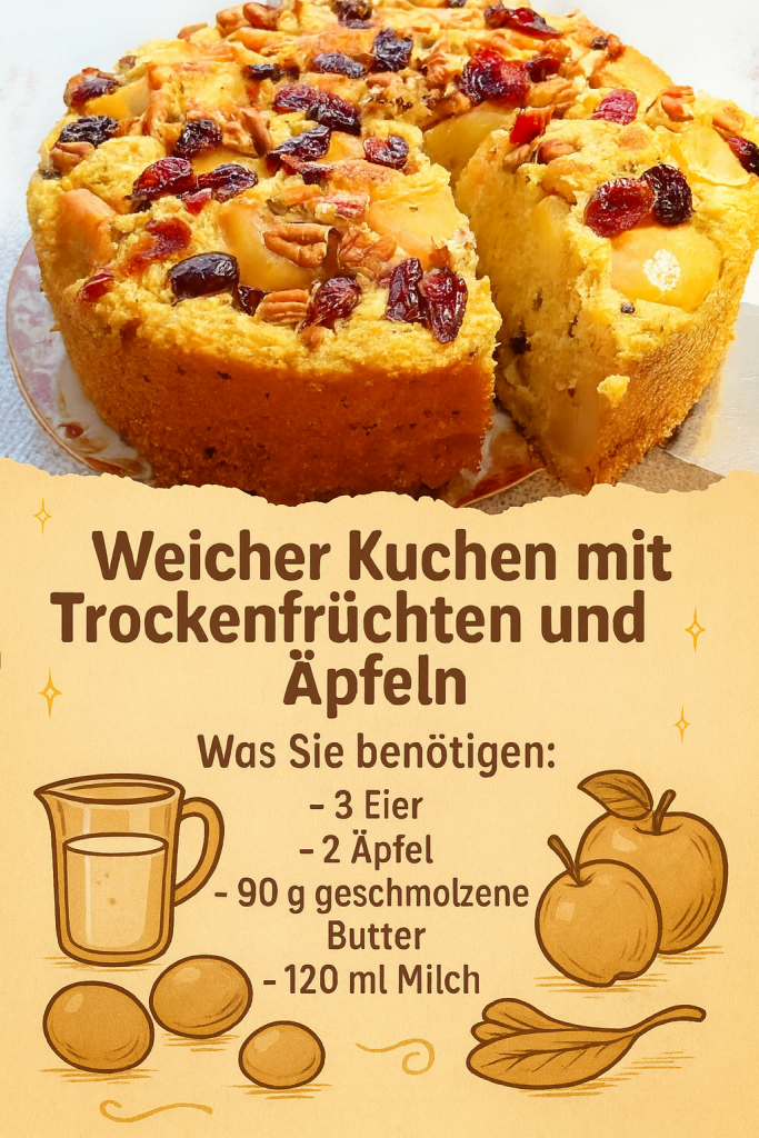 Die Masse in eine mit Backpapier ausgelegte Form füllen. Dünne Apfelscheiben oben darauf legen und mit etwas Trockenobst dekorieren.