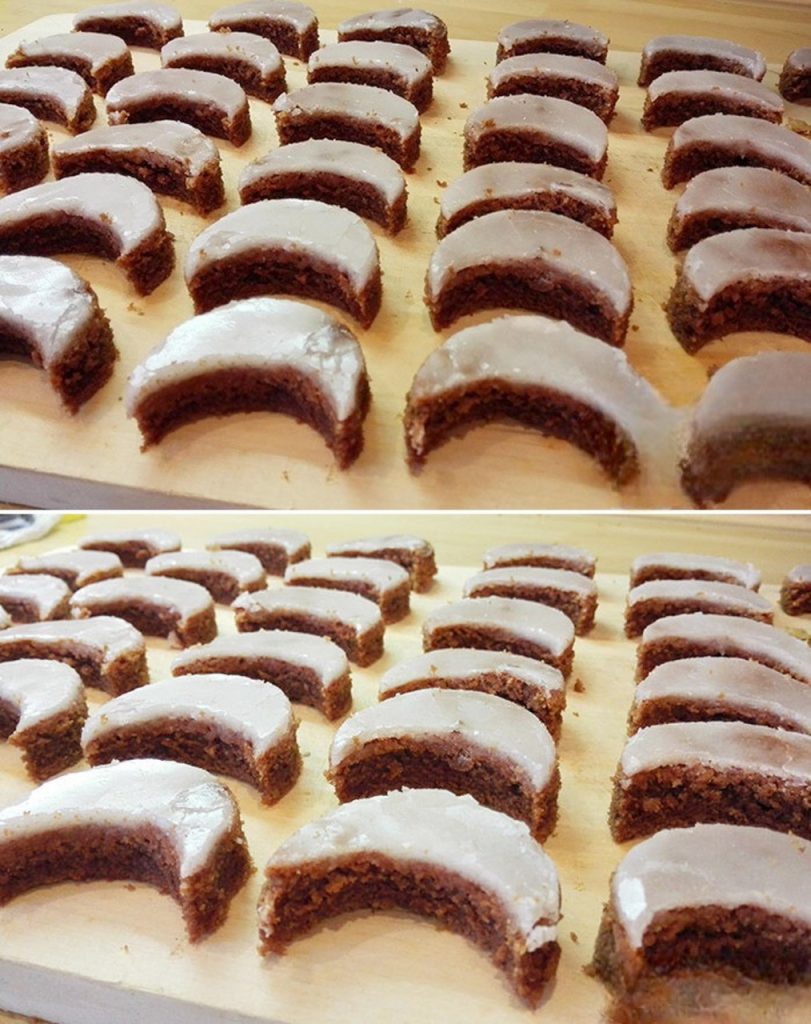 3. Puderzucker mit Rum zu einer glatten Glasur verrühren, den warmen Kuchen bestreichen und vollständig auskühlen lassen. Mit einem runden Ausstecher Kreise formen und halbmondförmig anrichten. die namen bitte