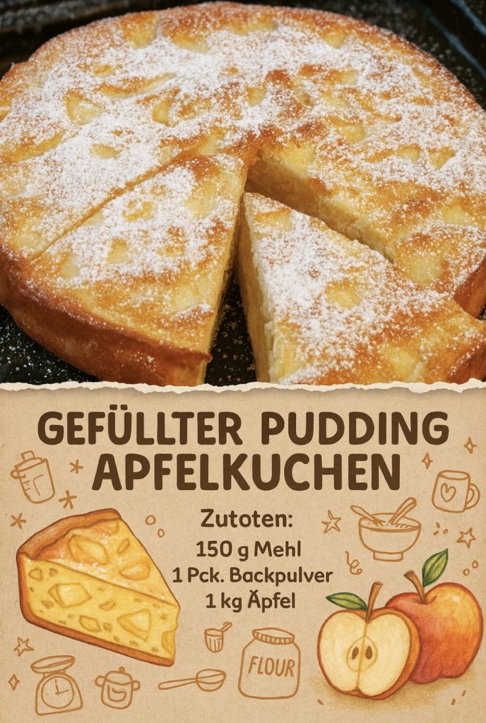 Für die Füllung kocht man einen Sahnepudding nach Anleitung auf der Rückseite der Verpackung, benutzt dafür aber statt der Milch die süße Sahne und insgesamt 150 g Zucker. Den fertigen, noch gut warmen Pudding von der Kochstelle nehmen und die gewürfelten Äpfel einrühren.