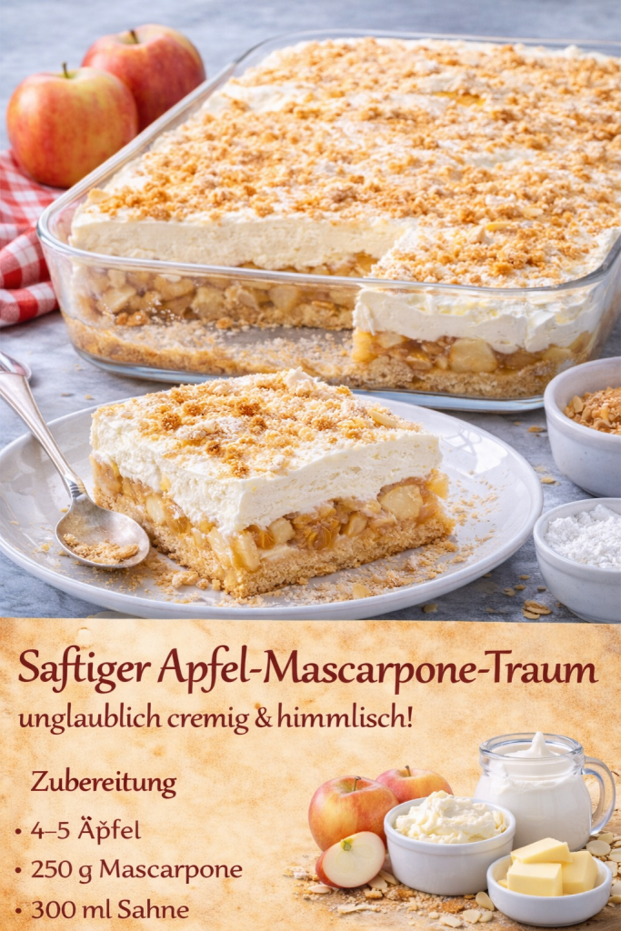Ein unglaublich cremiger Apfelkuchen mit Zimt, Mascarpone und Sahne – weich, saftig und einfach unwiderstehlich. Schmilzt förmlich im Mund!