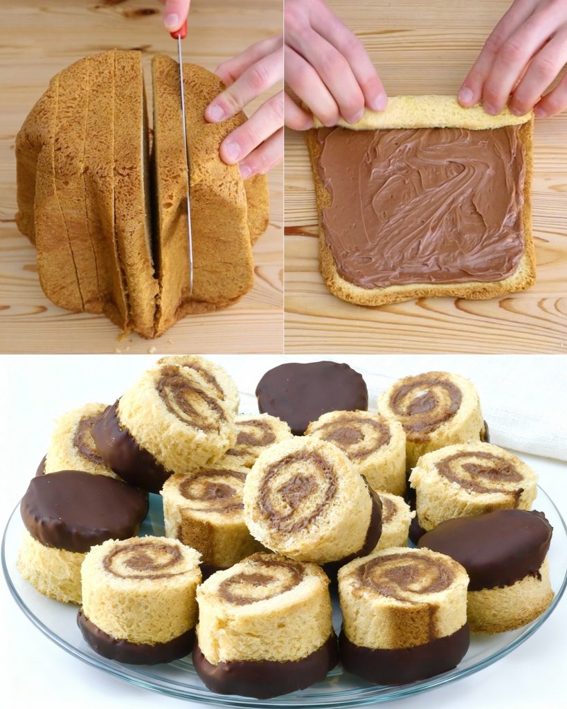 2. Nach Wunsch Schokocreme oder Marmelade darauf verteilen. Scheiben eng aufrollen und als Schnecken auf ein mit Backpapier belegtes Blech legen.