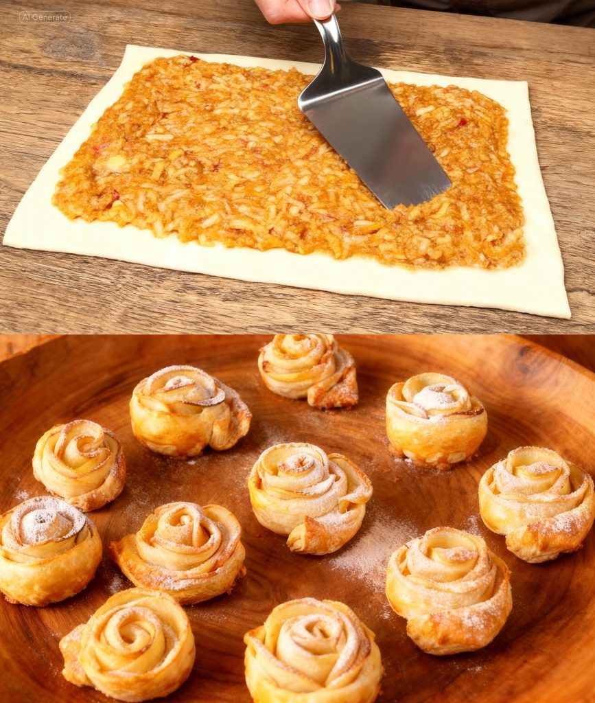 1. Äpfel schälen, reiben und mit Zucker und Zimt mischen. Blätterteig rechteckig ausrollen, Apfelmasse gleichmäßig darauf verteilen und an den Rändern etwas frei lassen.