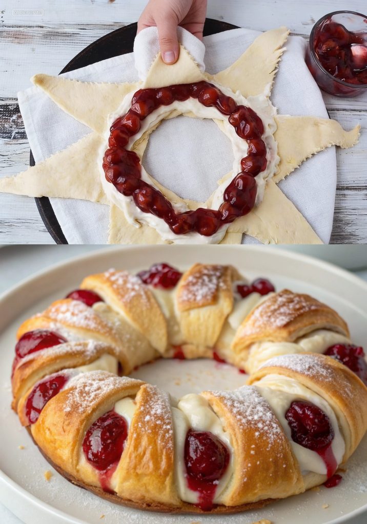 2. Croissant-Teig ringförmig auslegen, Creme darauf verteilen und Kirschen darübergeben.