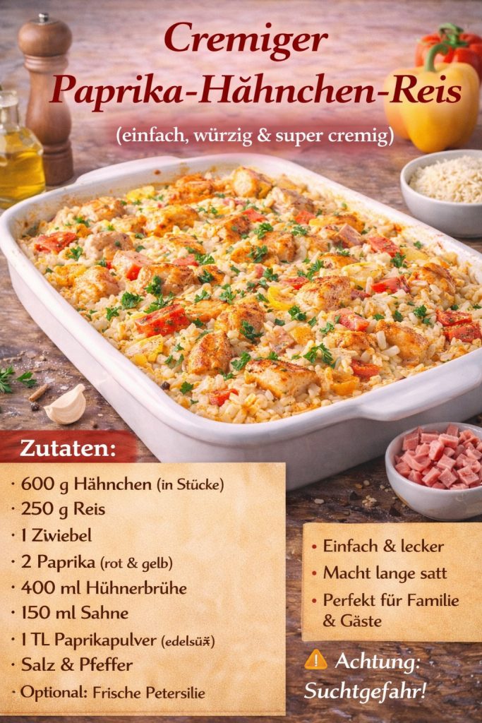 Zarte Hähnchenstücke, aromatischer Reis und eine cremige Paprika-Sauce ![]()