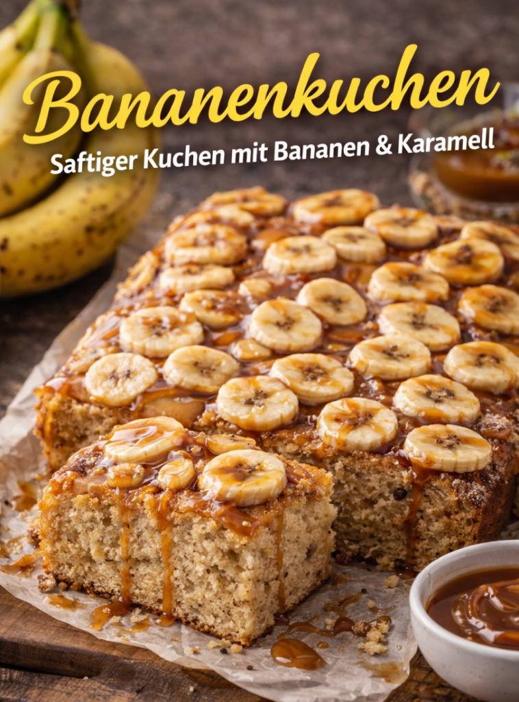 Bananenscheiben darauflegen und leicht andrücken. Im vorgeheizten Ofen bei 180 °C Ober-/Unterhitze ca. 40–45 Minuten backen.