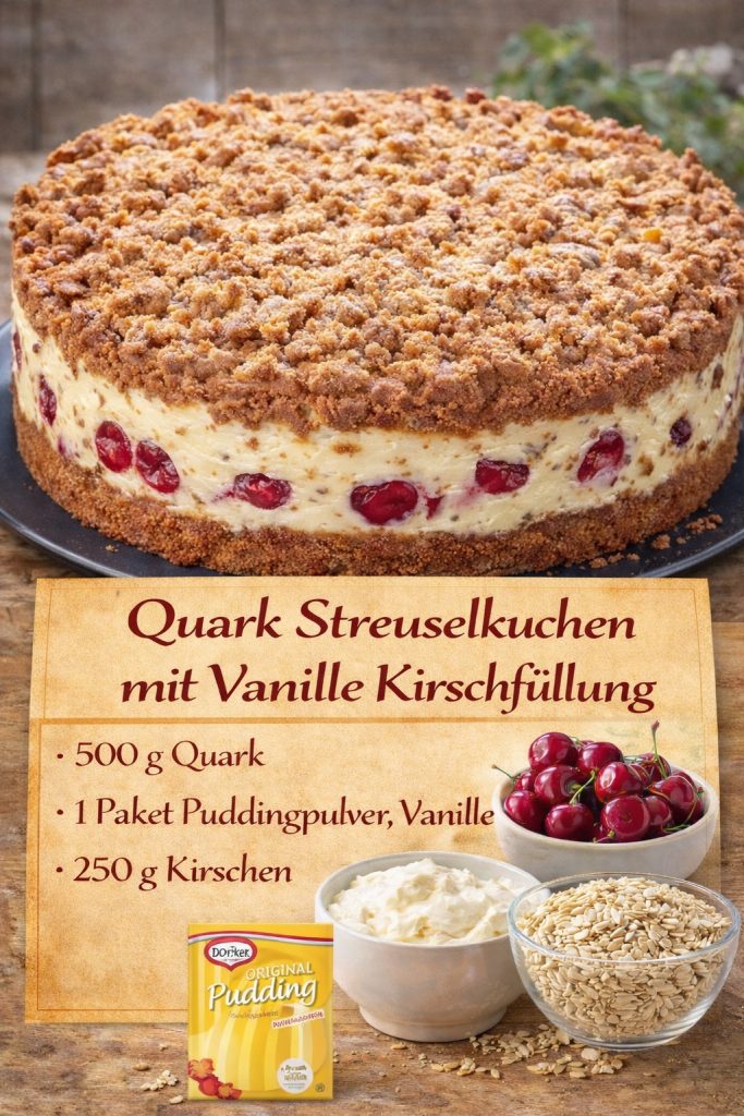 Achtung Suchtfaktor, Quark Streuselkuchen mit Vanille Kirschfüllung