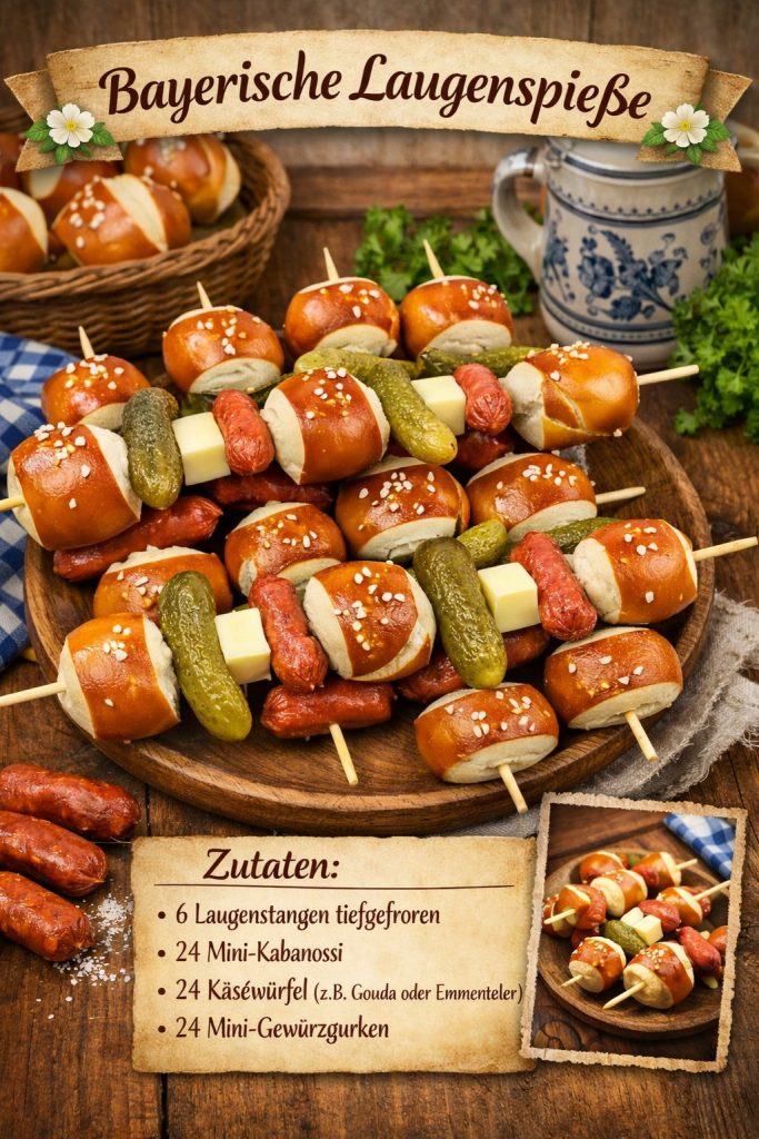 Herzhafte bayerische Laugenspieße mit Mini-Kabanossi, Käsewürfeln und knackigen Gewürzgurken. Perfekt als Party-Snack, fürs Buffet oder zur Brotzeit – warm und kalt ein Genuss!