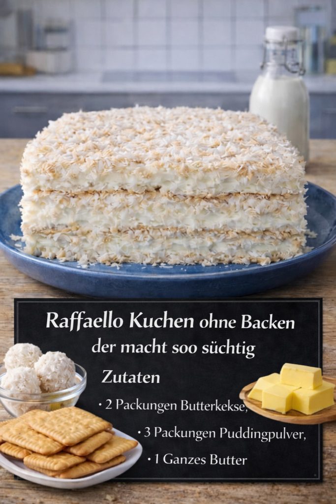 Oberfläche mit Kokosraspeln bestreuen und nach Wunsch Raffaello darauflegen.