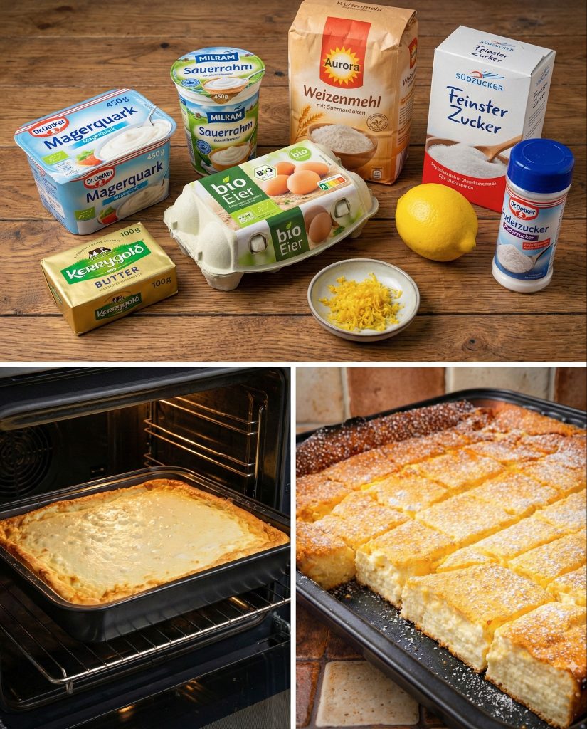 Den Quark mit Sauerrahm mischen, dazu fügen wir weiche Butter, Eier und schließlich Mehl und Zitronenschale hinzu. Dann das alles verrühren zum gleichmäßigen Teig.