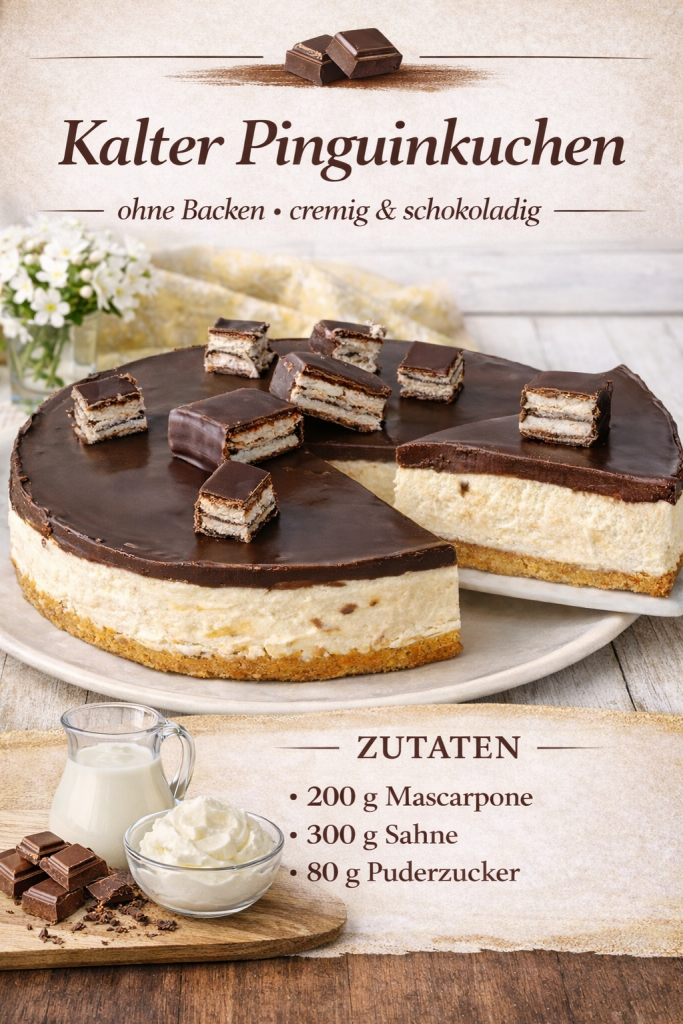 Wir servieren den Kuchen, indem wir ihn mit Pinguin dekorieren und in Scheiben schneiden.