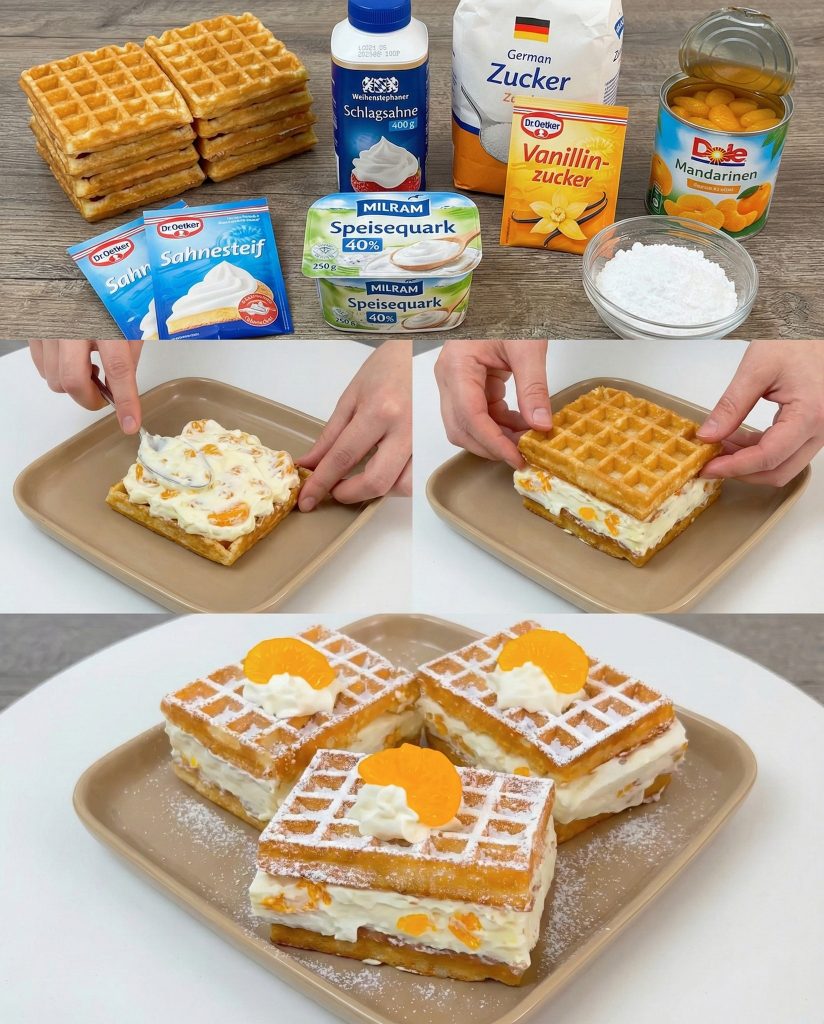 Die Waffeln in eine Backform legen und die Füllung darauf verteilen. Als nächstes noch eine weitere Schicht Waffeln auf die Füllung legen.