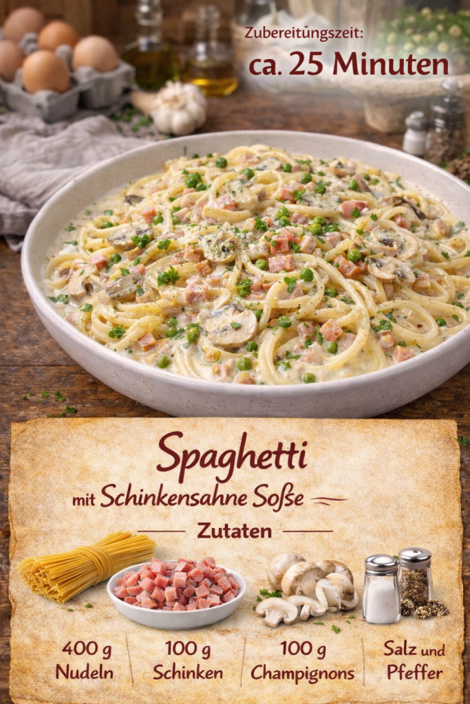 Die Schinkenwürfel in einer heißen Pfanne oder einem Topf, groß genug, anbraten. Dann die Knoblauchzehe hinzupressen und zusammen mit einem Schuss Olivenöl kurz anschwitzen. Die Nudeln roh hinzugeben, mit den flüssigen Zutaten (Sahne, Milch, Wasser) übergießen und das Gemüsebrühpulver für die Brühe hinzufügen. Dann ca. 12 Minuten einkochen lassen, dabei regelmäßig umrühren, damit die Nudeln nicht zusammenkleben.