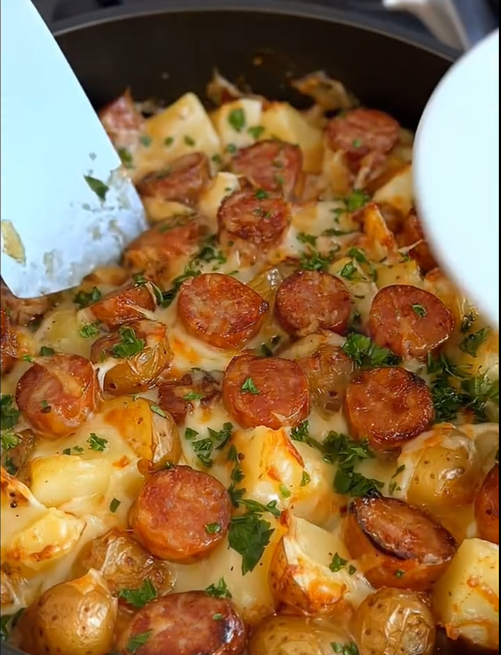 Die Kartoffeln sollten weich und goldbraun sein und die Wurst leicht knusprige Ränder bekommen.